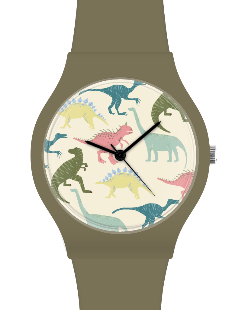 Esfera esmaltada con estampado de dinosaurios. Correa de silicona HQ acabado premium, hebilla simple, caja y trabilla color khaki. Corona simple metálica. Compuesto de tres agujas metálicas, color negro. Maquinaria y batería japonesa.