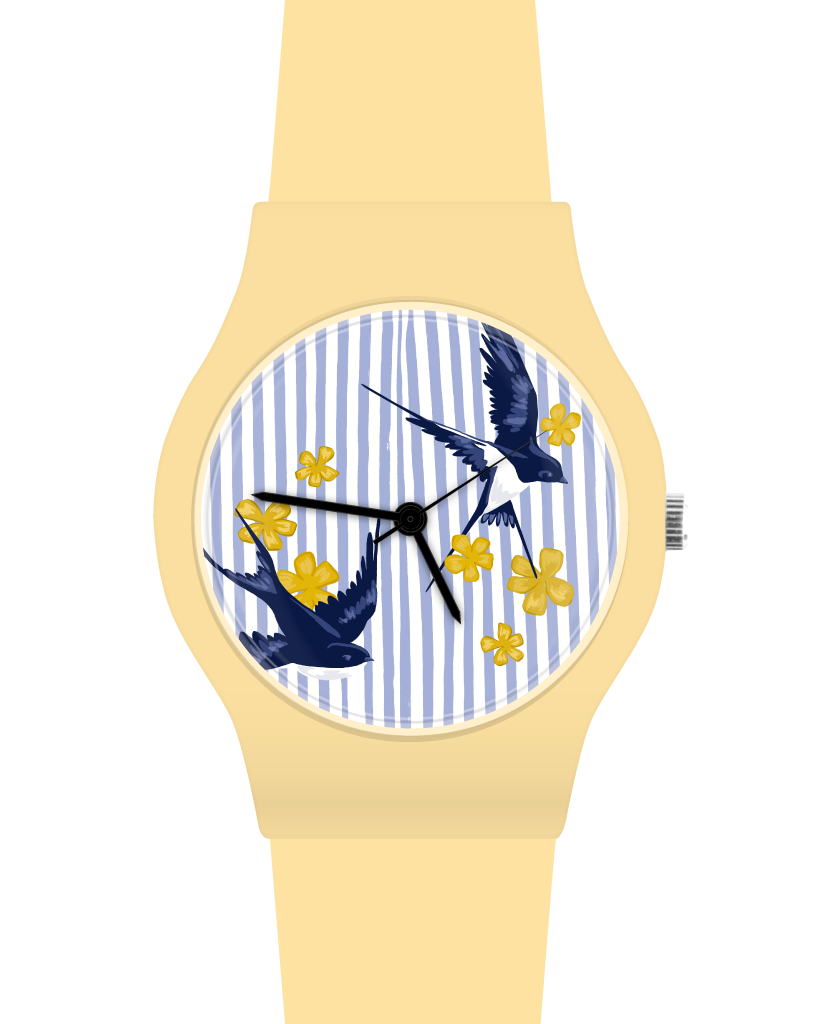 Esfera esmaltada con estampado de pájaros y flores. Correa de silicona HQ acabado premium, hebilla simple, caja y trabilla color amarillo claro. Corona simple metálica. Compuesto de tres agujas metálicas, color negro. Movimiento japonés.