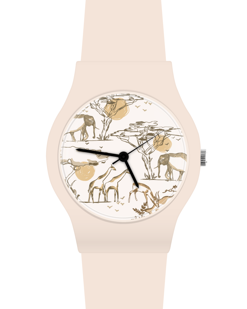 Esfera esmaltada con estampado de animales y paisaje. Correa de silicona HQ acabado Premium, hebilla simple, caja y trabilla color nude. Corona simple metálica. Compuesto de tres agujas metálicas, color negro. Movimiento japonés.