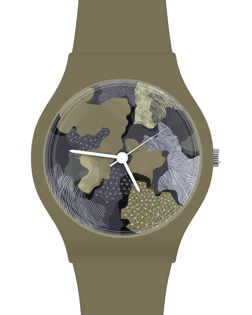 Esfera esmaltada con estampado de camuflaje. Correa de silicona HQ acabado premium, hebilla simple, caja y trabilla color khaki. Corona simple metálica. Compuesto de tres agujas metálicas, color blanco. Maquinaria y batería japonesa.