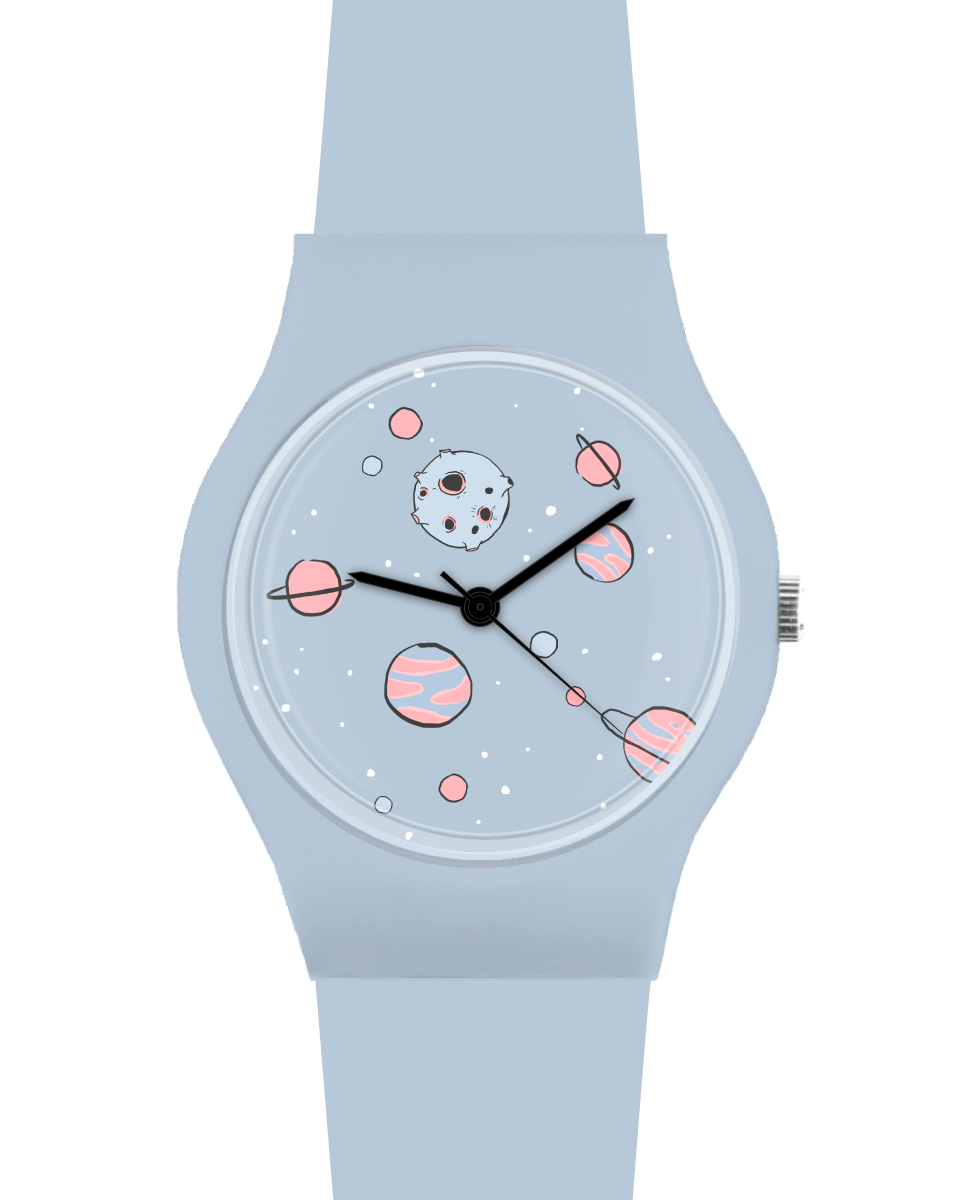 Esfera esmaltada con estampado de planetas. Correa de silicona HQ acabado Premium, hebilla simple, caja y trabilla color azul pálido. Corona simple metálica. Compuesto de tres agujas metálicas, color negro. Maquinaria y batería japonesa.