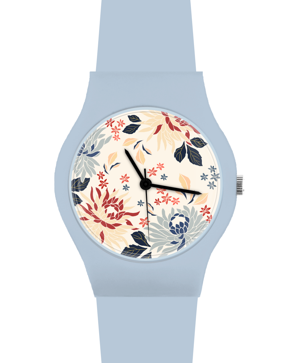 Esfera esmaltada con estampado de flores de loto y vegetación japonesa. Correa de silicona HQ acabado Premium, hebilla simple, caja y trabilla color azul pálido. Corona simple metálica. Compuesto de tres agujas metálicas, color negro. Maquinaria y batería japonesa.