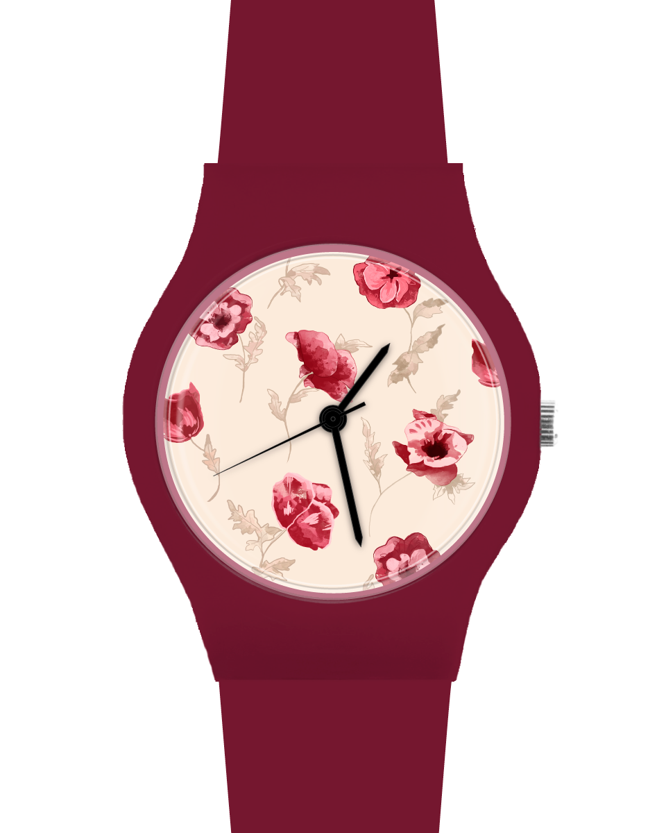 Esfera esmaltada con estampado de pequeñas amapolas. Correa de silicona HQ acabado Premium, hebilla simple, caja y trabilla color garnet. Corona simple metálica. Compuesto de tres agujas metálicas, color negro. Maquinaria y batería japonesa.