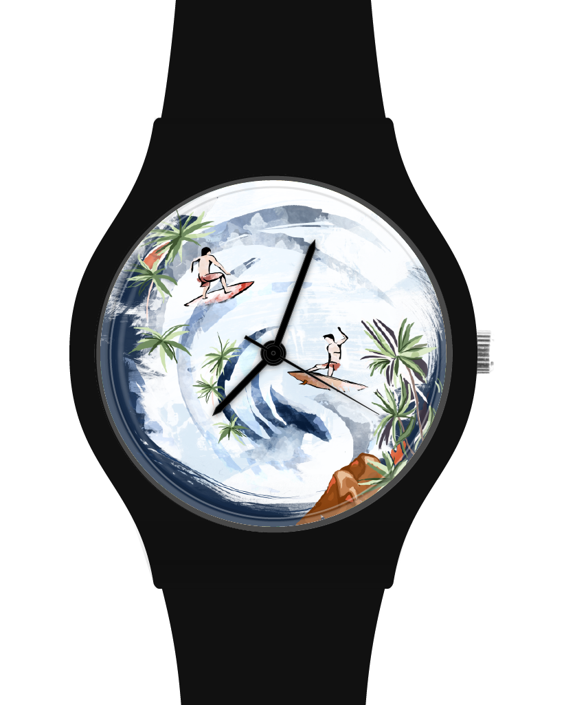 Esfera esmaltada con estampado de surfistas. Correa de silicona HQ acabado premium, hebilla simple, caja y trabilla color negro. Corona simple metálica. Compuesto de tres agujas metálicas, color negro. Maquinaria y batería japonesa.