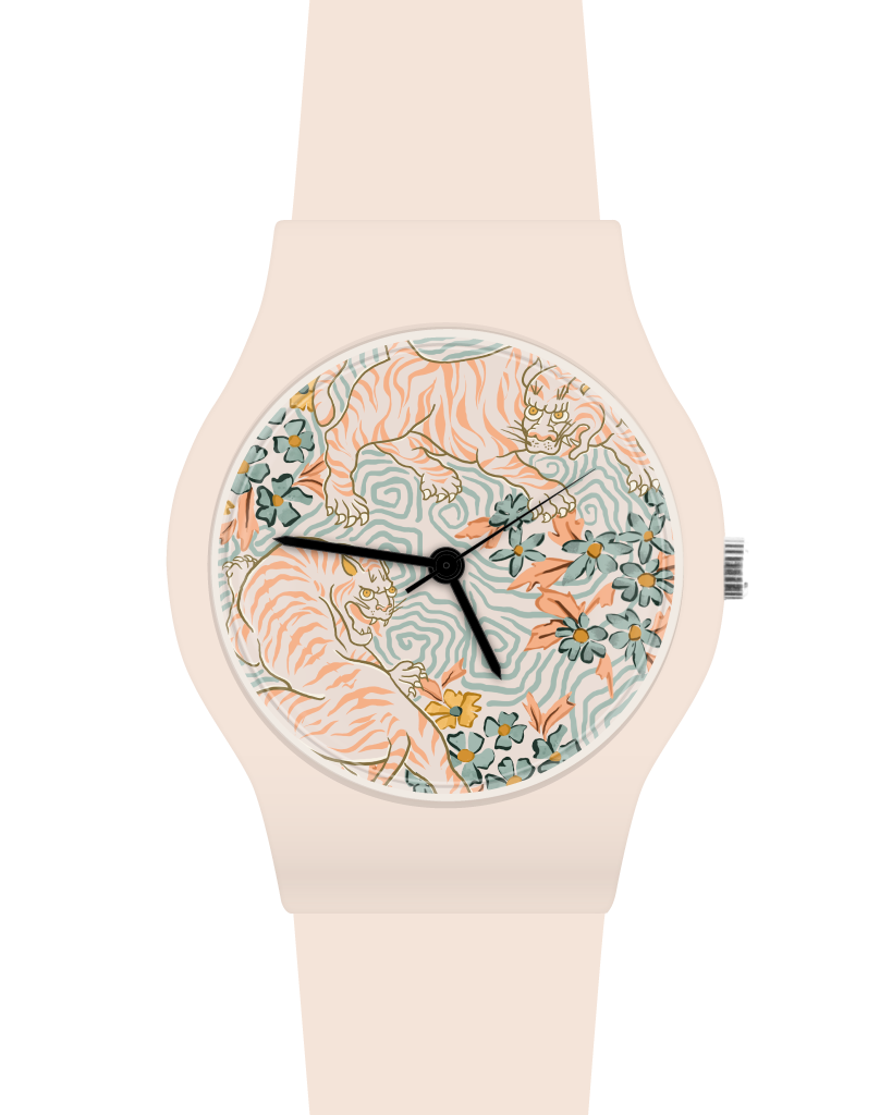 Esfera esmaltada con estampado de motivo japonés. Correa de silicona HQ acabado premium, hebilla simple, caja y trabilla color nude. Corona simple metálica. Compuesto de tres agujas metálicas, color negro. Maquinaria y batería japonesa. Maquinaria y batería japonesa.