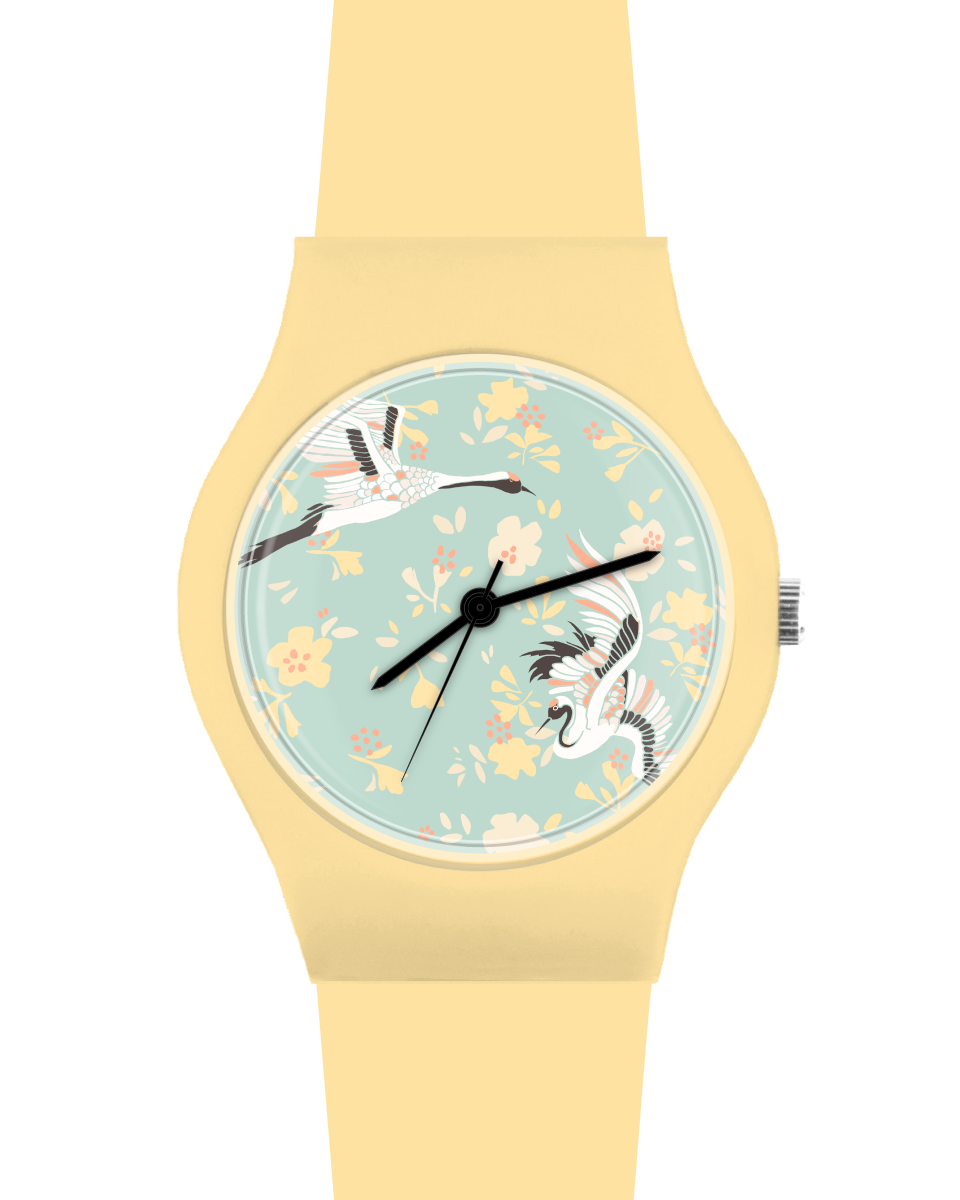 Esfera esmaltada con estampado de motivo japonés. Correa de silicona HQ acabado premium, hebilla simple, caja y trabilla color amarillo claro. Corona simple metálica. Compuesto de tres agujas metálicas, color negro. Maquinaria y batería japonesa. Maquinaria y batería japonesa.